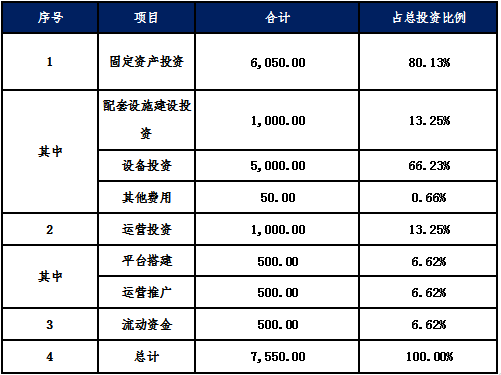 項(xiàng)目總投資7,550.00萬(wàn)元,其中固定資產(chǎn)投資6,050.00萬(wàn)元;運(yùn)營(yíng)投入資金1000.00萬(wàn)元;流動(dòng)資金500.00萬(wàn)元。