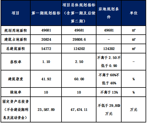 如上表所示,項目總體規(guī)劃指標(biāo)(含第一期及后續(xù)第二期,第二期由于落地時間較長,待后續(xù)落地建設(shè)時再進行可行性研究,本報告主要針對項目第一期進行可行性分析)符合宗地規(guī)劃條件。
