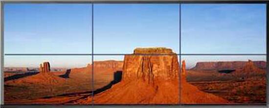 如上圖,其中有四個液晶單元可拼接顯示一幅大畫面,圖中的是2行2列的組合拼接,其他的屏幕可單屏顯示其他信號。全屏拼接顯示: