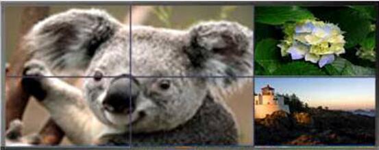 如上圖,每個液晶單元可以單獨(dú)顯示一路電腦畫面或監(jiān)控錄像等圖像格式,每個單元顯示的信號可任意切換。組合拼接顯示: