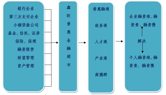 項目模式可簡單闡述為:以山東鑫旺集團(tuán)為依托,通過(某某市)鑫旺普惠金融超市,整合當(dāng)?shù)亟鹑跈C構(gòu),為當(dāng)?shù)貍€人、中小企業(yè)提供免費咨詢、培訓(xùn)、專業(yè)指導(dǎo)、金融貸款產(chǎn)品對接等金融服務(wù),從而解決企業(yè)融資難、融資貴、融資慢難題。最終實現(xiàn)直接盤活地方經(jīng)濟(jì)、增加地方稅收、增加地方就業(yè)、等民生問題,并有利于解決地方引進(jìn)各大行業(yè)專業(yè)人才,提高地方政治、經(jīng)濟(jì)地位。