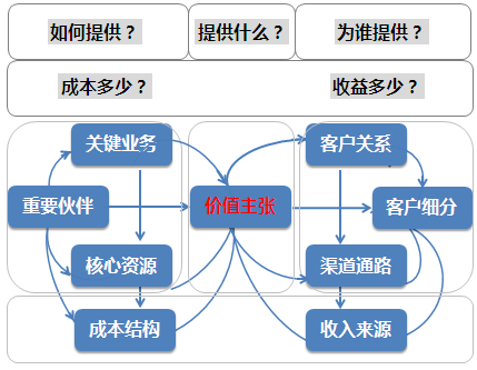 為此,商業(yè)模式一般拆解為九個要素進行分析;其中價值主張統(tǒng)領其他分析,左側(cè)通過關鍵業(yè)務、重要伙伴、核心資源,最終分析出成本構成;右側(cè)通過客戶細分、客戶關系、渠道通路等分析,最終分析出收入來源。最后綜合分析,將最終能分析出商業(yè)模式的可行性。企業(yè)通過對商業(yè)模式中各要素的設計,將能設計出能帶來最大利潤空間的商業(yè)模式。