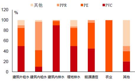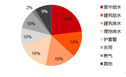 塑料管道下游需求廣泛,主要包括建筑用的給排水以及采暖、市政建設(shè)中的給排水及采暖、農(nóng)業(yè)給排水以及灌溉用管、電力通信護(hù)套管、工業(yè)排污管、燃?xì)夤艿赖取?