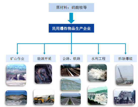 民爆器材是各種用于非軍事目的的工業(yè)炸藥及起爆器材的總稱,常用的工業(yè)炸藥有銨油炸藥、水膠炸藥、乳化炸藥。民爆行業(yè)上游為生產(chǎn)所需的基礎(chǔ)化工原料,下游則是煤炭、金融、非金融等礦山開采,以及鐵路、公路、水利等基礎(chǔ)設(shè)施建設(shè)。