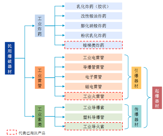 工業(yè)炸藥是指用于采礦和工程爆破等作業(yè)的炸藥; 工業(yè)雷管是指在管殼內(nèi)裝有起爆藥和猛炸藥的工業(yè)火工品; 工業(yè)索類火工品是指具有連續(xù)細(xì)長(zhǎng)裝藥的索狀工業(yè)火工品的總稱。3大類民爆器材的主要產(chǎn)品如下圖所示: