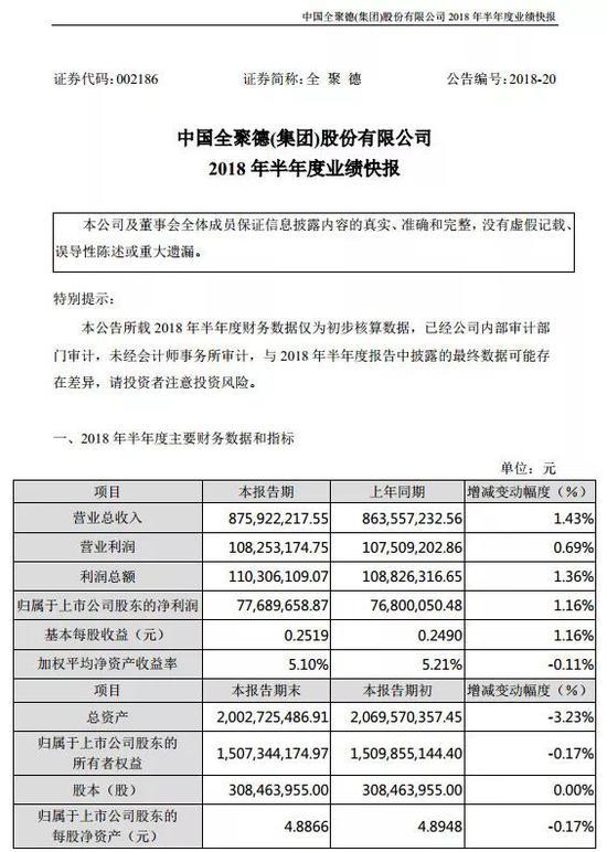 7月19日晚間,全聚德發(fā)布了2018年半年度業(yè)績快報,實現(xiàn)營業(yè)總收入接近8.76億元,同比增長僅為1.43%左右;歸屬于上市公司股東的凈利潤約為0.78億元,同比增長為1.16%。...