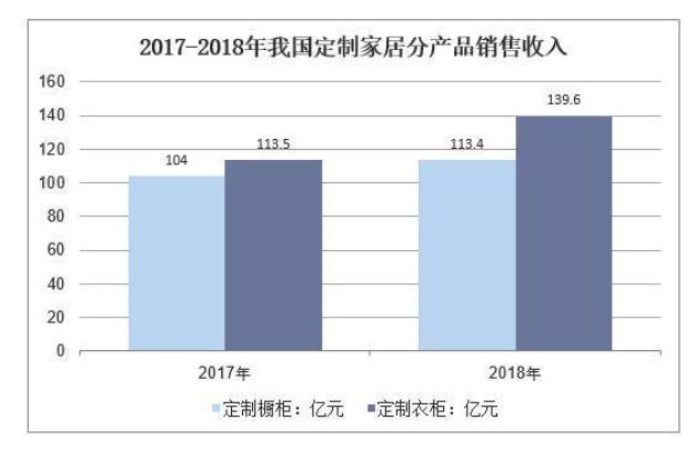2018年我國定制櫥柜市場銷售收入為113.4億元,同比增長9%;定制衣柜市場銷售收入為139.6億元,同比增長23%。