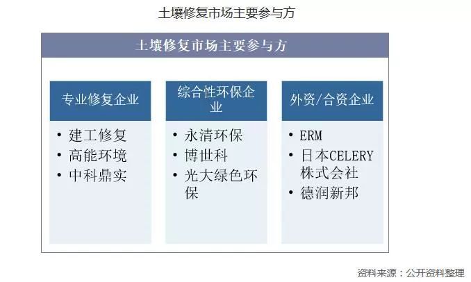 目前土壤修復行業(yè)的參與者主要來源于三方面:第一類是專業(yè)的土壤修復企業(yè),如:建工修復、高能環(huán)境、中科鼎實(京藍科技子公司),中節(jié)能大地等;第二類是向土壤修復領(lǐng)域延伸業(yè)務(wù)的傳統(tǒng)環(huán)保企業(yè),如:永清環(huán)保、博世科、光大綠色環(huán)保等;第三類是進入中國土壤修復市場的外資企業(yè),如:ERM、日本CELERY株式會社、重慶德潤新邦環(huán)境修復有限公司(蘇伊士集團與重慶德潤環(huán)境有限公司、重慶渝富資產(chǎn)經(jīng)營管理集團有限公司、重慶市環(huán)境科學研究院共同投資組建)。