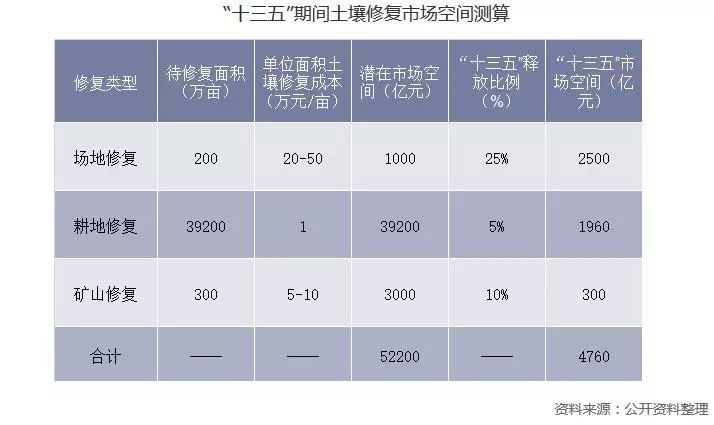 目前土壤修復的主要類型包括場地修復、耕地修復以及礦山修復,預計我國土壤修復潛在的市場空間約為52200億元,“十三五”期間可釋放約4760億元,其中場地修復市場空間將占到一半以上。因為場地修復來自于工業(yè)用地的經(jīng)濟效應(yīng),場地的修復能得到資本的認可從而啟動和治理都會相對順利,所以會是未來較長一段時間的主流應(yīng)用場景。