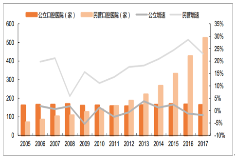 我國(guó)口腔??漆t(yī)院中公立和民營(yíng)數(shù)量及增速