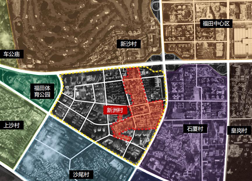 500多歲的新洲村,在沙頭圩南約1公里處,因被先建的石廈、沙嘴和沙尾三個村莊圍繞,形似小洲而得名。由北村、中心村、南村和祠堂村四個自然村組成,村民全部姓簡。村中主要的辦公類建筑包括國稅綜合大樓、中央西谷大廈、民生銀行大廈、國通大廈、湖北大廈,同時擁有33個主要住宅項目。
