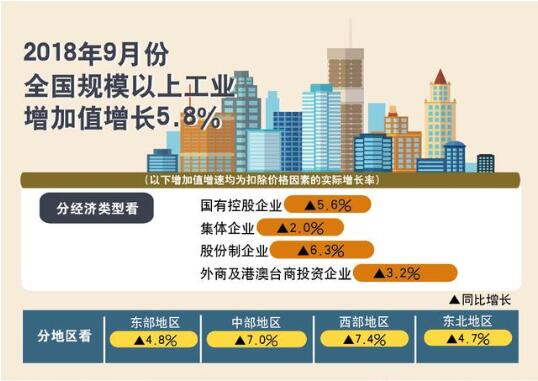 2018年9月份,規(guī)模以上工業(yè)增加值同比實際增長5.8%(以下增加值增速均為扣除價格因素的實際增長率),比8月份回落0.3個百分點。從環(huán)比看,9月份,規(guī)模以上工業(yè)增加值比上月增長0.50%。1-9月份,規(guī)模以上工業(yè)增加值同比增長6.4%,增速較1-8份回落0.1個...