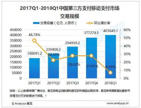 根據(jù)Analysys易觀發(fā)布的《中國(guó)第三方支付移動(dòng)支付市場(chǎng)季度監(jiān)測(cè)報(bào)告2018年第1季度》數(shù)據(jù)顯示,2018年第一季度,中國(guó)第三方支付移動(dòng)支付市場(chǎng)交易規(guī)模達(dá)403645.1億元人民幣,環(huán)比增長(zhǎng)6.99%。...