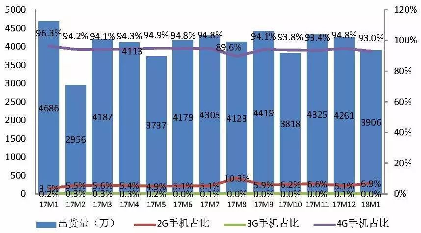 2018年1月,國(guó)內(nèi)手機(jī)市場(chǎng)出貨量3906.4萬(wàn)部,同比下降16.6%;上市新機(jī)型51款,同比下降19.0%...