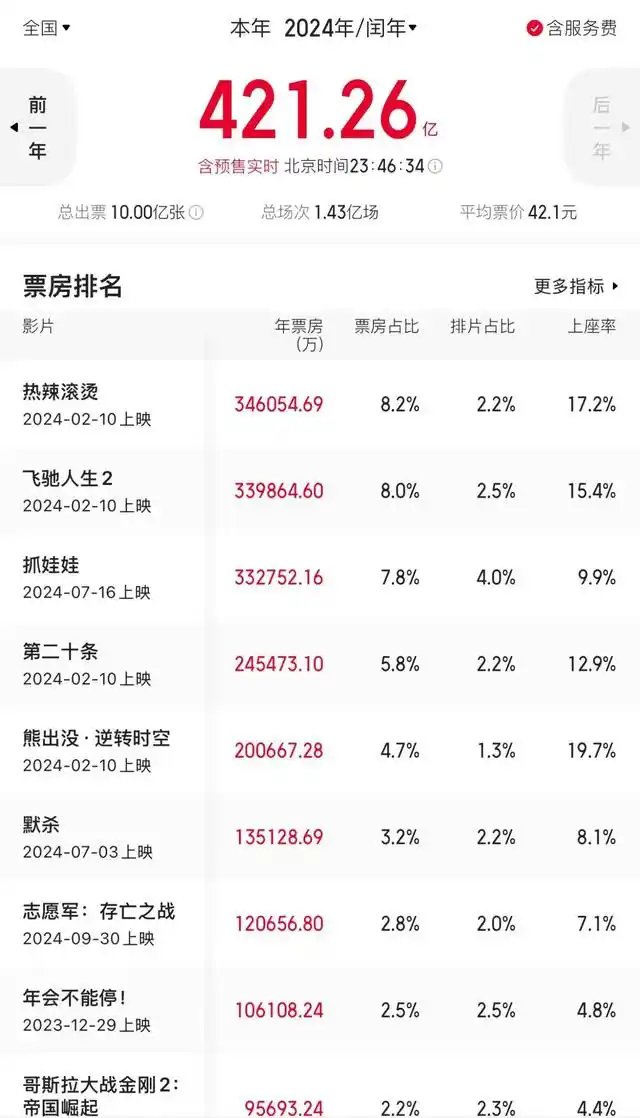 據(jù)貓眼專業(yè)版數(shù)據(jù),2024年12月28日23時(shí)46分,2024年度總觀影人次突破10億!總票房421.26億,總場(chǎng)次1.43億場(chǎng),平均票價(jià)42.1元,《抓娃娃》領(lǐng)跑2024年觀影人次榜!...