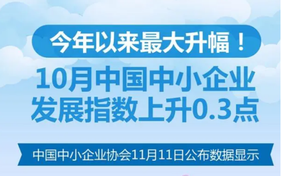 中國中小企業(yè)協(xié)會今天發(fā)布,10月中國中小企業(yè)發(fā)展指數(shù)為89,較9月上升0.3點(diǎn),為今年最大升幅,也是去年3月份以來的最大單月升幅。...